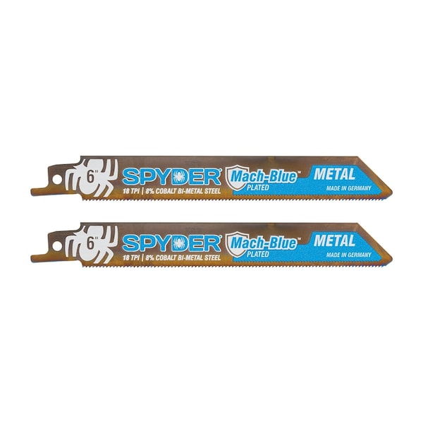 Spyder Mach-Blue reciprocating saw blades cut through a variety of tough materials ranging from wood with nails, to steel and stainless steel, to plastics and more. Proprietary Mach-Blue plating retains sharper cutting edges and reduces heat build-up, resulting in faster cuts and exceptionally long blade life - up to 20x longer lasting than conventional bi-metal blades.