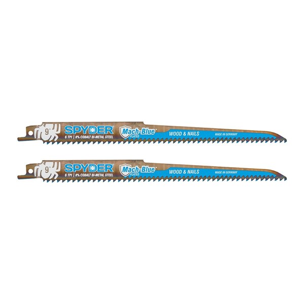 Spyder Mach-Blue reciprocating saw blades cut through a variety of tough materials ranging from wood with nails, to steel and stainless steel, to plastics and more. Proprietary Mach-Blue plating retains sharper cutting edges and reduces heat build-up, resulting in faster cuts and exceptionally long blade life - up to 20x longer lasting than conventional bi-metal blades.