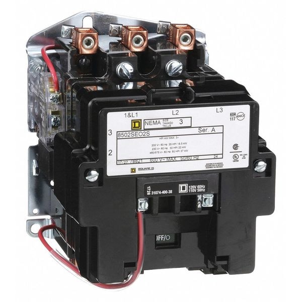 NEMA Magnetic Contactor, Auxiliary Contact Form Auxiliary Contacts Not Included, NEMA Enclosure Rating No Enclosure, NEMA Size 3, Coil Voltage 120V AC, Number of Poles 3, Full Load Current - Inductive 90 A, Reversing Capability Non-Reversing, Overall Height 7.09 in, Overall Width 5.47 in, Terminal Connection Type Screw Clamp Terminals, Series 8502, Number of Auxillary Contacts 0, Contactor Style NEMA, Horsepower @ Three Phase - 240V AC 30 hp, Horsepower @ Three Phase - 480V AC 50 hp, Phase Three