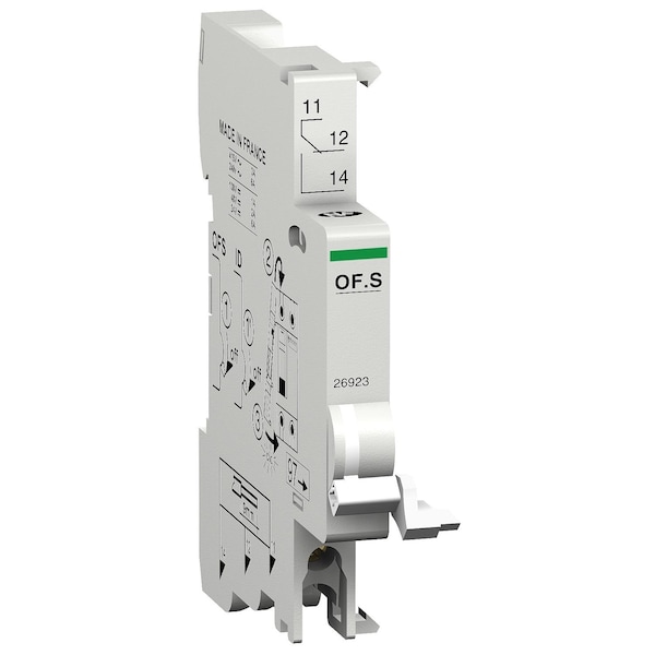 This Multi9 auxiliary contact is an open/close contact (OC). It is fixed on DIN rail. The In rated current is 6A at 240VAC with a 50/60Hz frequency.