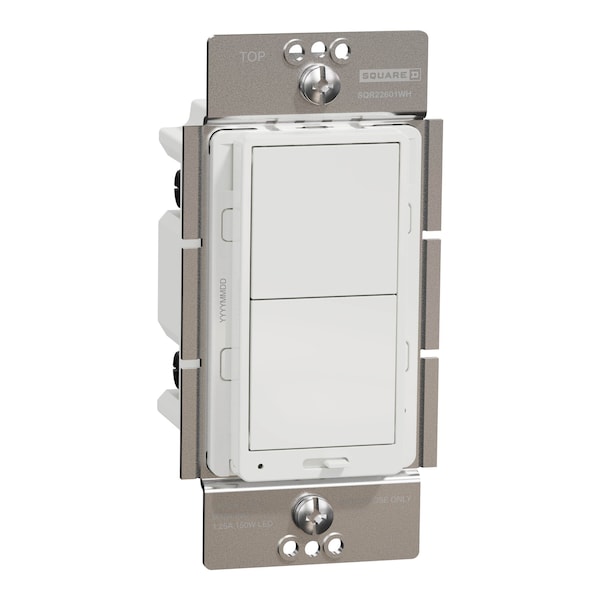 The Square D X Series 15A 600W Single-Pole/3-way Rocker Dimmer refreshes a room with modern design. The rated operational voltage of this dimmer is 120V. The mechanism with fixing frame belongs to X Series aesthetic group. The connection are screw terminal. Enjoy the easy-to-use dimming to create the right lighting scene and to reduce your energy usage. It eliminates near-off flickering on LED lights. Complete the look with one of the Square D X Series cover plates (not provided) that easily snaps into place for a modern, flush-facing finish to your walls. It features protective painted surface treatment. This dimmer benefits from an elegant matt finishing, constituting an added value for your interior design. This dimmer has a width of 51 mm, a height of 104 mm and a depth of 47 mm. Its Ue rated operational voltage is 120VAC. Its Ie rated operational current is 15A. This device has load of 600W ideal for controlling incandescent and halogen bulbs. It has load of 150W for compact fluorescent and LED lamps. This device enables flush mounting. This device is light almond with matte surface finish, easy installations and easy-to-clean. This device is compliant with UL and cULus certification.