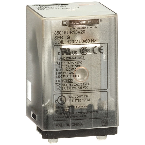 General Purpose Relay, Base Shape Square, Coil Voltage 120V AC, Contact Form 3PDT, Current Rating 10 A, Electrical Connection Quick-Connect, Flat Pin Width 0.189 in, Number of Pins 11, Pin Shape Flat, Sealing Enclosed, Status Indicator Mechanical Flag, Contact Rating (AC) 10 A @ 300V, Contact Rating (DC) 5 A @ 30V, Horsepower @ 120V AC 1/3 hp, Horsepower @ 240V AC Not Rated, Mounting Style Socket, Push-To-Test Method No Button, Body Depth 2.12 in, Body Height 2.67 in, Body Width 1.37 in