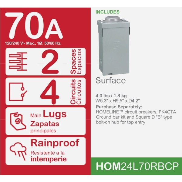 Homeline main lugs only. Can be used when spaces for more circuits are needed as a secondary or add on load center connected to the main disconnect load center. Single-phase 3-wire. Cover included ground bar kits must be ordered separately. Accepts only Homeline circuit breakers. Ideal for residential and commercial power distribution. Built with plated aluminum bus bar that is tested and listed only for Homeline circuit breakers. Engineered for fast installation and wire savings. For outdoor use.