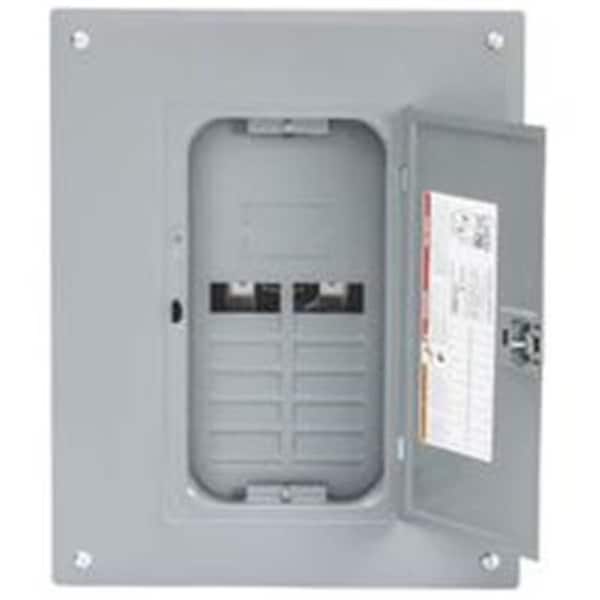 Main lug indoor load center, 125 amp 8 space/16 circuit. Convertible to a main breaker with a QOM1 main breaker. Single-phase load center, NEMA type 1 enclosure, combination flush/surface indoor cover. Overhead or underground feed options. Plated aluminum bus bar.
