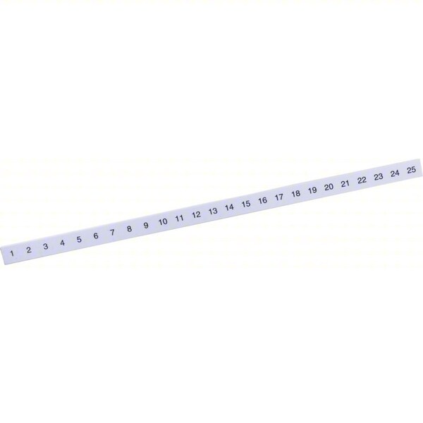 Marking Strip, Compatible Manufacturer Model Number 9080GK6, 9080GR6, Compatible with Series 9080G, Marking Numbers 1 through 25, Material Vinyl, Number of Characters 25, Number of Markers per Strip 25, Number of Strips 5, Overall Depth 0.03 in, Overall Length 8.81 in, Overall Width 0.31 in, Color White, Compatible with Product Type 9080GK6 Terminal Blocks, Standards EU RoHS Directive Compliant, REACH