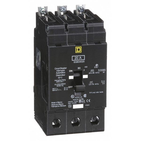 Miniature Circuit Breaker, Amps 20 A, AC Voltage Rating 480Y/277 V AC, Number of Poles 3, Circuit Breaker Mounting Style Bolt On, Series EGB, Terminal Connection Lug, Width 2.94 in, Depth 4.05 in, Standards cULus, UL Listed