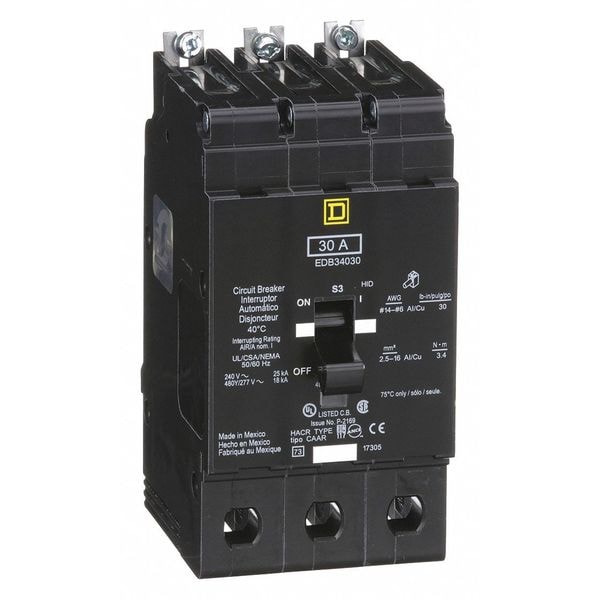 Miniature Circuit Breaker, Amps 30 A, AC Voltage Rating 277/480V AC, Circuit Breaker Type Standard, Number of Poles 3, DC Voltage Rating 125V DC, Circuit Breaker Actuator Toggle, Circuit Breaker Mounting Style Bolt On, Compatible Panelboard/Load Center Series NF, Phase Three, Series EDB, Max. AIR Rating 18kA at 277/480V AC, For Use With Square D NF Panelboards, Terminal Connection Lug, Frame Size 125A/EDB, Length 5.66 in, Width 2.94 in, Depth 4.05 in, Max. Operating Temp. 104 Degrees F