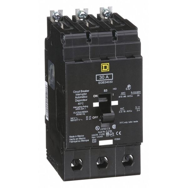 Miniature Circuit Breaker, Amps 30 A, AC Voltage Rating 480Y/277 V AC, Number of Poles 3, Circuit Breaker Mounting Style Bolt On, Series EGB, Terminal Connection Lug, Width 2.94 in, Depth 4.05 in, Standards cULus, UL Listed