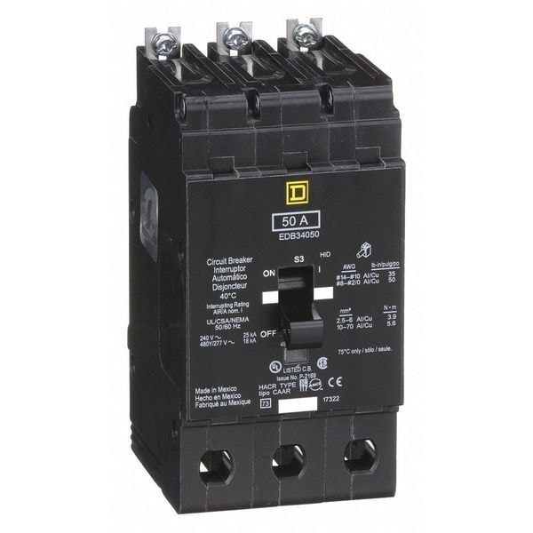 Miniature Circuit Breaker, Amps 50 A, AC Voltage Rating 277/480V AC, Circuit Breaker Type Standard, Number of Poles 3, DC Voltage Rating 125/250V DC, Circuit Breaker Actuator Toggle, Circuit Breaker Mounting Style Bolt On, Compatible Panelboard/Load Center Series NF, Phase Three, Series EDB, Max. AIR Rating 18kA at 277/480V AC, For Use With Square D NF Panelboards, Terminal Connection Lug, Frame Size 125A/EDB, Length 5.66 in, Width 2.94 in, Depth 4.05 in, Max. Operating Temp. 104 Degrees F