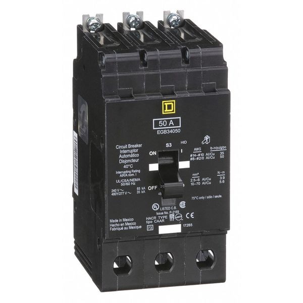 Miniature Circuit Breaker, Amps 50 A, AC Voltage Rating 277/480V AC, Circuit Breaker Type Standard, Number of Poles 3, DC Voltage Rating Not Rated, Circuit Breaker Actuator Toggle, Circuit Breaker Mounting Style Bolt On, Compatible Panelboard/Load Center Series NF, Phase Three, Series EGB, Max. AIR Rating 35kA at 277/488V AC, For Use With Square D NF Panelboards, Terminal Connection Lug, Frame Size 125A/EGB, Length 5.66 in, Width 2.94 in, Depth 4.05 in, Min. Operating Temp. 77 Degrees F