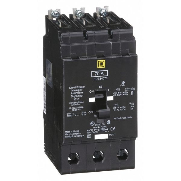 Miniature Circuit Breaker, Amps 70 A, AC Voltage Rating 277/480V AC, Circuit Breaker Type Standard, Number of Poles 3, DC Voltage Rating 125/250V DC, Circuit Breaker Actuator Toggle, Circuit Breaker Mounting Style Bolt On, Compatible Panelboard/Load Center Series NF, Phase Three, Series EDB, Max. AIR Rating 18kA at 277/480V AC, For Use With Square D NF Panelboards, Terminal Connection Lug, Frame Size 125A/EDB, Length 5.66 in, Width 2.94 in, Depth 4.05 in, Max. Operating Temp. 104 Degrees F
