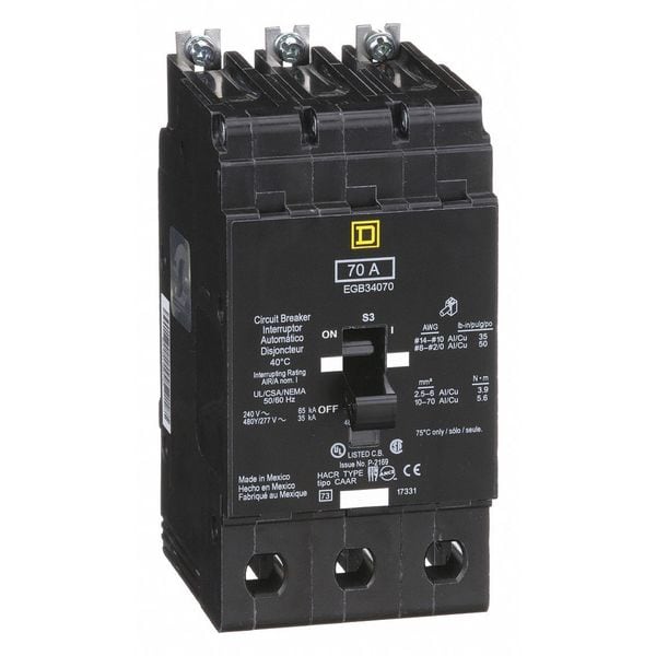 Miniature Circuit Breaker, Amps 70 A, AC Voltage Rating 277/480V AC, Circuit Breaker Type Standard, Number of Poles 3, DC Voltage Rating Not Rated, Circuit Breaker Actuator Toggle, Circuit Breaker Mounting Style Bolt On, Compatible Panelboard/Load Center Series NF, Phase Three, Series EGB, Max. AIR Rating 35kA at 277/488V AC, For Use With Square D NF Panelboards, Terminal Connection Lug, Frame Size 125A/EGB, Length 5.66 in, Width 2.94 in, Depth 4.05 in, Min. Operating Temp. 77 Degrees F