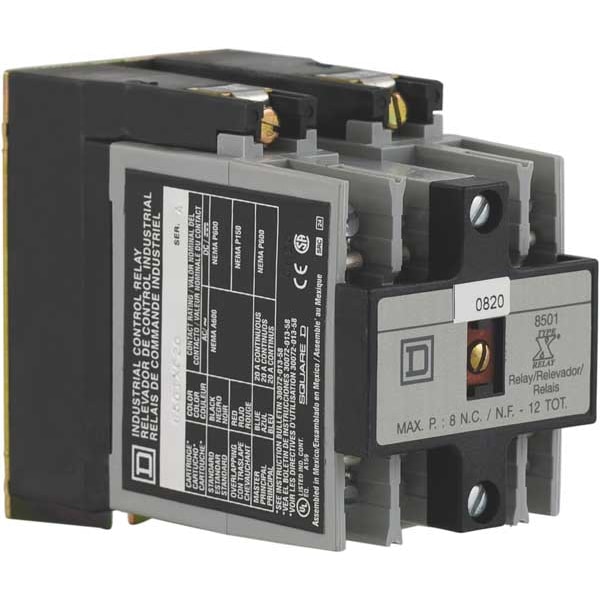 NEMA Control Relay, Current Rating 10 A, Contact Form 2NO, Contact Rating (DC) 0.2 A @ 301-600V, 0.55 A @ 250V, 0.8 A @ 250V, 1.1 A @ 125V, 4 A @ 125V, Coil Voltage 24V AC, Contact Rating (AC) 10 A @ 600V, Relay Style NEMA, Electrical Connection Screw Clamp, Mounting Style Surface, Power Consumption 23 VA, Compatible with Series 8501 Type X Latching Control Relays, Maximum Operating Temperature 160 Degrees F, Frequency 60 Hz, Body Depth 3.95 in, Body Height 3.5 in, Body Width 2.23 in