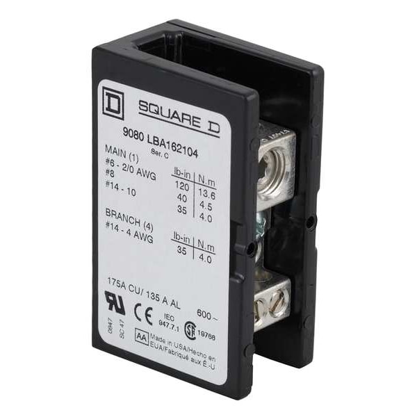 Power Distribution Block, For Conductor Material Aluminum, Copper, Line Connections/Pole 1, Line Side Stud Size Not Applicable, For Line Copper Wire Size - Minimum 14 AWG, For Line Copper Wire Size - Maximum 2/0 AWG, Load Connections/Pole 4, Load Side Stud Size Not Applicable, For Load Copper Wire Size - Minimum 14 AWG, For Load Copper Wire Size - Maximum 4 AWG, Maximum Current - Copper Conductor 175 A, Maximum Voltage 600 V, Mounting Type Surface, Number of Poles 1, Overall Depth 1.78 in