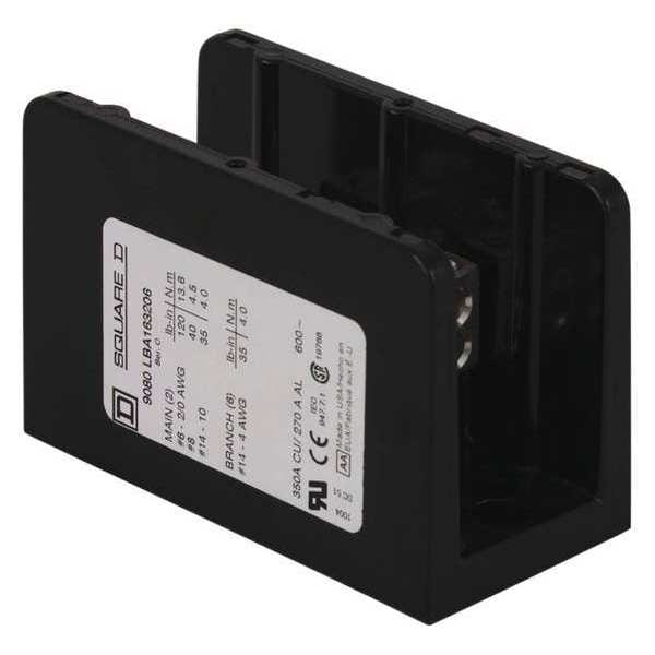 Power Distribution Block 600V 350A, For Conductor Material Aluminum, Copper, Line Connections/Pole 2, For Line Copper Wire Size - Minimum 14 AWG, For Line Copper Wire Size - Maximum 2/0 AWG, Load Connections/Pole 6, For Load Copper Wire Size - Minimum 14 AWG, For Load Copper Wire Size - Maximum 4 AWG, Maximum Current - Copper Conductor 350 A, Maximum Voltage 600 V, Mounting Type Surface, Number of Poles 1, Overall Depth 2.61 in, Overall Length 4 in, Overall Width 1.94 in, Housing Color Black