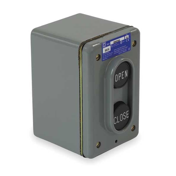 Control Station, Number of Operators 2, Number of Pilot Lights 0, Size 30 mm, Legend Open/Close, Type of Operator Push Button/Push Button, Action Momentary/Momentary, Operator Color (2) Black, Contact Form 2NO, Mechanical Interlock No, NEMA Rating 4, Contact Rating 5A @ 600V AC/24V DC, NEMA Contact Rating Designation B600/P600, IP Rating IP66, Mounting Wall, Hub 1/2 in to 3/4 in NPT, Height 3.6 in, Width 2.76 in, Depth 4.25 in, Enclosure Material Zinc, Enclosure Color Gray