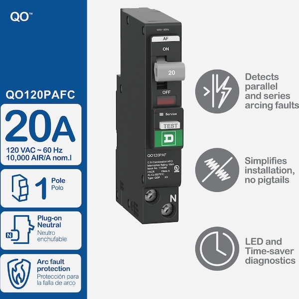 QO single-pole plug-on neutral CAFCI (combination arc-fault circuit interrupting) circuit breaker. Ideal for use to help protect your wires from arcing faults and is intended for overload and short-circuit protection of your electrical system. Designed for reliability connects directly to the neutral bar providing a time and labor-saving installation. Also provides several advantages such as fewer connections which lead to faster installation and an innovative neutral jaw eliminates pigtails which in turn frees gutter space. Time-Saver Diagnostics provide advanced trip indication technology helping identify the type of fault that has occurred faster. Time-Saver Diagnostics helps take away the guess work and provides diagnostic assistance by identifying the type of fault that last occurred. It saves money by reducing troubleshooting time simple to use accurate and reliable. QO circuit breakers have features no other manufacturer can offer.