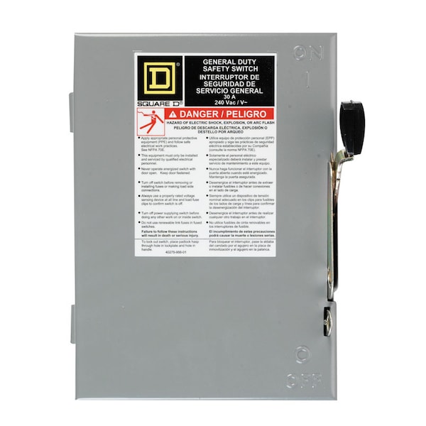 The Square D by Schneider Electric 30 amp, 240 volt and 3 Pole Indoor Fusible General Duty Safety Switch is designed for residential and commercial applications where durability and economy are prime considerations. Typical loads are lighting, air conditioning and appliances. This switch is suitable for use as service entrance equipment when equipped with a service grounding kit. The switch is UL listed, File E2875 and meet or exceed the NEMA Standard KS1. For more than 100 years the Square D brand safety switch has been the unchallenged leader in the market. We've continued our tradition of innovation, developing new features that provide an unsurpassed level of performance, reliability, safety and ease of installation. This tradition has resulted in the Square D brand being preferred two to one over our closest competitor.