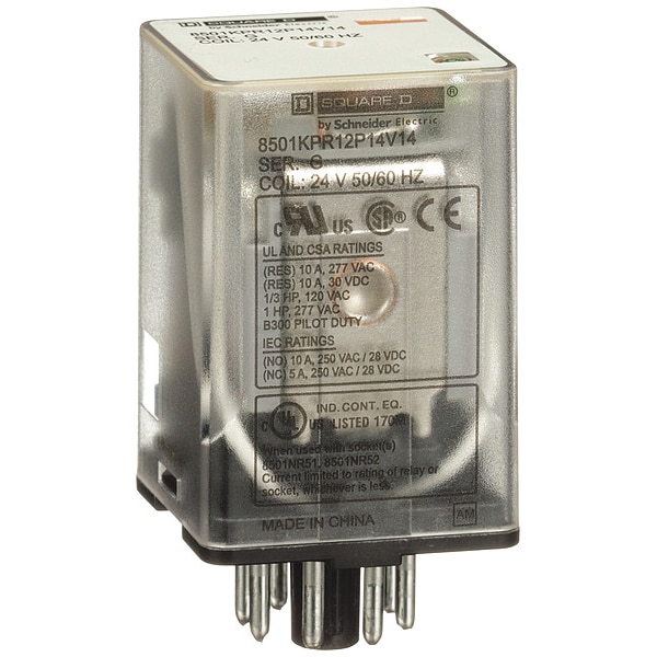 General Purpose Relay, Base Shape Octal, Coil Voltage 24V AC, Contact Form DPDT, Current Rating 10 A, Electrical Connection 8-Pin Terminal, Flat Pin Width Not Applicable, Number of Pins 8, Pin Shape Round, Sealing Enclosed, Status Indicator LED Indicator, Mechanical Flag, Contact Rating (AC) 10 A @ 300V, Contact Rating (DC) 5 A @ 30V, Horsepower @ 120V AC 1/3 hp, Horsepower @ 240V AC Not Rated, Mounting Style Socket, Push-To-Test Method No Button, Body Depth 1.94 in, Body Height 2.67 in