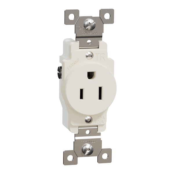The Square D X Series 15A 125V Tamper Resistant Heavy Duty Single Outlet provides a fast, safe way to update the look of your home's interior with new, modern receptacles. Elevate safety with discrete, tamper resistant shutters that help keep inappropriate objects out of the socket. Enjoy a consistent look across your room or home with the full line of Square D X Series switches, dimmers, sensors, and receptacles. Complete the look with one of the Square D X Series cover plates (not provided) that easily snaps into place for a modern, flush-facing finish to your walls. Enjoy fast wiring with a grounding strap hole designed for speed wrapping installation. The outlet is commercial grade, ideal for devices that stay plugged in. Its Ue rated operational voltage is 125VAC. Its Ie rated operational current is 15A.