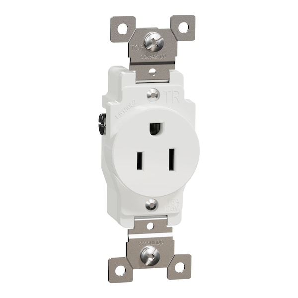 The Square D X Series 15A 125V Tamper Resistant Heavy Duty Single Outlet provides a fast, safe way to update the look of your home's interior with new, modern receptacles. Elevate safety with discrete, tamper resistant shutters that help keep inappropriate objects out of the socket. Enjoy a consistent look across your room or home with the full line of Square D X Series switches, dimmers, sensors, and receptacles. Complete the look with one of the Square D X Series cover plates (not provided) that easily snaps into place for a modern, flush-facing finish to your walls. Enjoy fast wiring with a grounding strap hole designed for speed wrapping installation. The outlet is commercial grade, ideal for devices that stay plugged in. Its Ue rated operational voltage is 125VAC. Its Ie rated operational current is 15A.