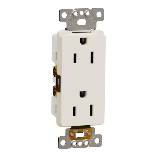 The Square D X Series 15A 125V Tamper Resistant Heavy Duty Duplex Decorator Receptacle with back wire clamps provides a fast, safe way to update the look of your home's interior with new, modern receptacles. Complete the look with one of the Square D X Series cover plates (not provided) that easily snaps into place for a modern, flush-facing finish to your walls. Enjoy a consistent look across your room or home with the full line of Square D X Series switches, dimmers, sensors, and receptacles. Enjoy fast wiring with "no-wrapping" screw installation and a self-grounding clip. Elevate safety with discrete, tamper resistant shutters that help keep inappropriate objects out of the socket. Its Ue rated operational voltage is 125VAC. Its Ie rated operational current is 15A.