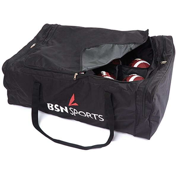 Features BSN Sports Football Bag Holds 12 official size footballs 36inL x 24inW x 16inH Heavy-duty 600 Denier polyester construction with rugged nylon zipper with wrap around handles and shoulder strap Interior dividers separate dry from wet footballs Includes zippered pockets on both ends for extra storage Specifications Weight: 3.52 lbs