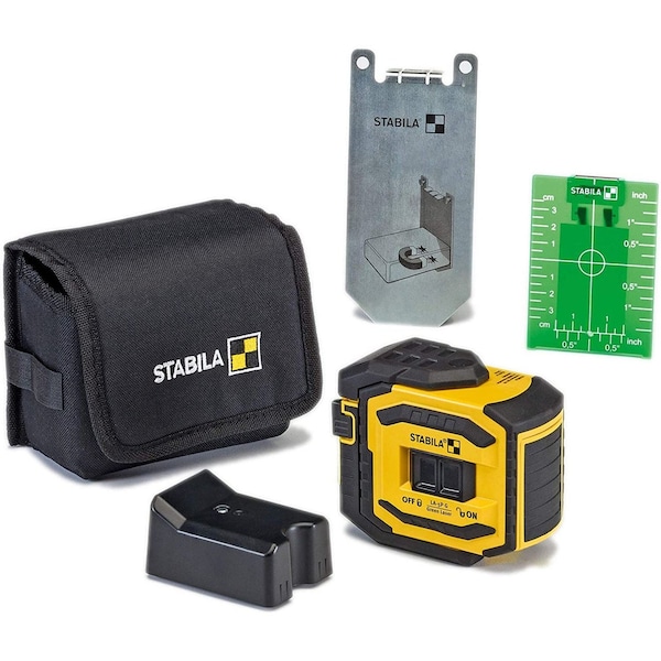 STABILA 03165 STABILA LA-5P Green Beam 5 Point LaserThe self-leveling, STABILA LA-5P G, projects 5-bright GREENBEAM laser dots, visible up to 60 ft. Layout points can be transferred and right angles can be set in an instant. It features a mechanical on/off switch and pendulum lock. This durable and compact, pouch laser is excellent for framing walls, interior and exterior. Builders will appreciate the ability to work directly against wood plates and metal track, in all conditions, even in brightly lit spaces. The highly efficient LA-5P G laser is powered by 3-AA batteries, providing you up to 15 hours of constant run time.ApplicationsPositioning/setting interior and exterior walls.Transferring layout points from floor to ceiling.Laying out square within 60 ft.FeaturesThe self-leveling STABILA LA-5P G Set features 5-bright GREENBEAM laser, pouch, removable framing base, target plate, metal wall mount plate and batteries.Quickly transfer layout points and set right angles, even in brightly lit conditions.The LA-5P G comes with a v-groove rare earth magnet built into the housing for secure attachment to metal.5 green bright and tight dots are visible up to 60ft.Up dot accuracy tolerance: Will not exceed 3/16 inat 50ft.Down dot accuracy tolerance: Will not exceed 1/4 at 50ft.Level dot accuracy tolerance: Will not exceed 3/16in at 50ft.Square dot accuracy tolerance: Will not exceed 1/8in at 50ft.Mechanical off/on switch with pendulum lock.Self-leveling range: 4.5 degrees.Up to 15 hours of constant run time on 3-AA batteries.Technical data Specifications: Laser class2 Output< 1 mWLaser waveLength 510 - 530 nmSelf-levelling range +/-4.501/4 Levelling accuracy +/-3/16 in at 30 ft Laser beam accuracy up +/-3/16 in at 30 ft Laser beam accuracy down +/-1/8 in at 30 ft Measuring range of visible point60 ftOperating life20 hProtection classIP 54 Tripod connection1/4in-20