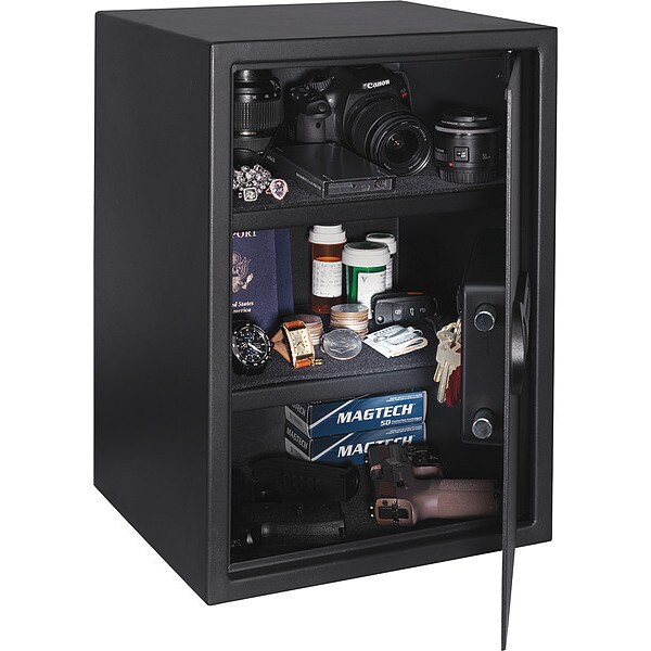 Security Safe, Black, Net Weight 42 lb, Capacity 2.33 cu ft, None Fire Rated, Water Endurance 0, Material Steel, Finish Matte, Number of Shelves (2) Adjustable, Lock Style Biometric, Number of Bolts 2, Outside Height 19 3/4 in, Outside Width 14 in, Outside Depth 12 1/4 in, Inside Height 20 in, Inside Width 14 in, Inside Depth 10 in, Door Opening Height 18 in, Door Opening Width 13 in, Face Height 20 in, Face Width 13 in, Holds Small Firearms, Valuables