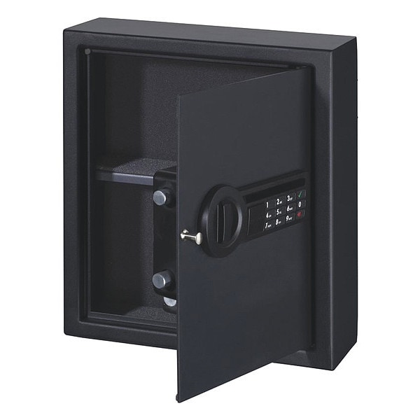 Wall Safe, Black, Net Weight 13.5 lb, Capacity 0.74 cu ft, None Fire Rated, Water Endurance 0, Material Steel, Finish Matte, Number of Shelves 0, Lock Style Electronic, Number of Bolts 2, Outside Height 4 1/2 in, Outside Width 14 in, Outside Depth 11 1/2 in, Inside Height 14 in, Inside Width 12 in, Inside Depth 3 in, Door Opening Height 13 in, Door Opening Width 11 in, Face Height 14 3/4 in, Face Width 12 in, Holds Small Firearms, Valuables, Meets DOJ Testing for Firearms Safety Device Listing