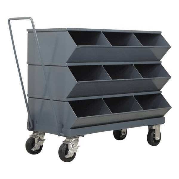 Sectional Bin Unit, Steel, High Gloss, Gray, Overall Depth 20 1/2 in, Overall Height 32 in, Overall Width 37 in, Load Capacity per Shelf 3,600 lb, Whole Unit Load Capacity 3,600 lb, Base Type Caster, Base Height 5 3/8 in, Number of Compartments 9, Compartment Depth 20 1/2 in, Compartment Height 9 1/2 in, Compartment Width 12 in, Includes (3) 3-Compartment #4 Sectional Stacking Bin Units, Mobile Truck, Top Cover