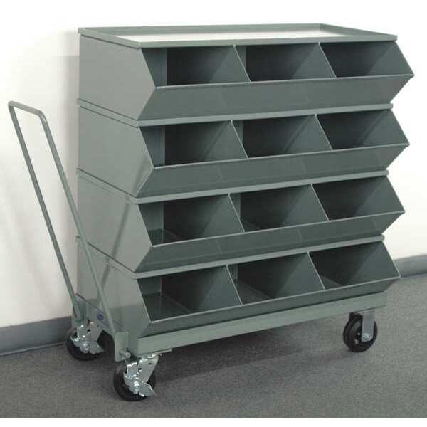 Sectional Bin Unit, Steel, High Gloss, Gray, Overall Depth 5 3/8 in, Overall Height 40 7/8 in, Overall Width 37 in, Load Capacity per Shelf 3,600 lb, Whole Unit Load Capacity 2,000 lb, Base Type Caster, Base Height 5 3/8 in, Number of Compartments 12, Compartment Depth 20 1/2 in, Compartment Height 9 1/2 in, Compartment Width 12 in, Includes (4) 3-Compartment #4 Sectional Stacking Bin Units, Mobile Truck, Top Cover