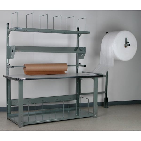 (4) Way Adjustable Spool Holder; 16" Deep Carton Shelf with Hoop Dividers, a Tiltable 12" Deep Steel Shelf, a Full Depth Bottom Shelf with Hoop Dividers and a Holder for the Material on the Side Mount Unit