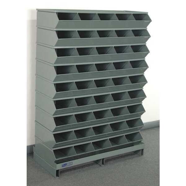 Sectional Bin Unit, Steel, High Gloss, Gray, Overall Depth 3 1/8 in, Overall Height 52 in, Overall Width 37 in, Load Capacity per Shelf 5,000 lb, Whole Unit Load Capacity 3,500 lb, Base Type Pallet, Base Height 3 1/8 in, Number of Compartments 45, Compartment Depth 15 1/2 in, Compartment Height 6 in, Compartment Width 7 1/2 in, Includes (9) 5-Compartment #2 Sectional Stacking Bin Units, Pallet Base, Top Cover