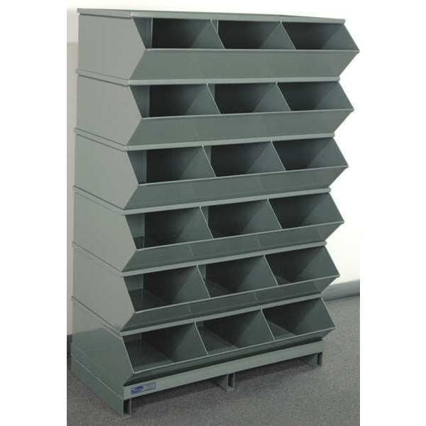 Sectional Bin Unit, Steel, High Gloss, Gray, Overall Depth 20 1/2 in, Overall Height 55 3/4 in, Overall Width 37 in, Load Capacity per Shelf 5,000 lb, Whole Unit Load Capacity 3,500 lb, Base Type Pallet, Base Height 3 1/8 in, Number of Compartments 18, Compartment Depth 20 1/2 in, Compartment Height 9 1/2 in, Compartment Width 12 in, Includes (10) 5-Compartment #2 Sectional Stacking Bin Units, Pallet Base, Top Cover