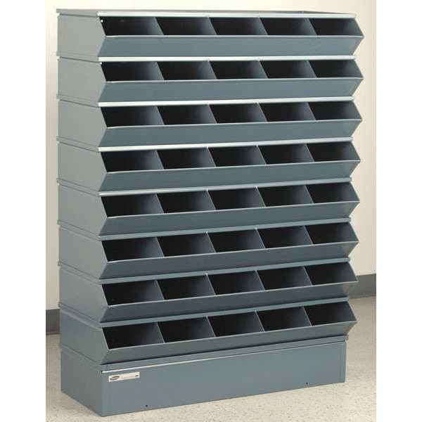 Sectional Bin Unit, Steel, High Gloss, Gray, Overall Depth 37 in, Overall Height 48 in, Overall Width 13 in, Load Capacity per Shelf 5,000 lb, Whole Unit Load Capacity 1,000 lb, Base Type Standard, Base Height 5 3/8 in, Number of Compartments 40, Compartment Depth 15 1/2 in, Compartment Height 6 in, Compartment Width 7 1/2 in, Includes (8) 5-Compartment #2 Sectional Stacking Bin Units, Base, Top Cover