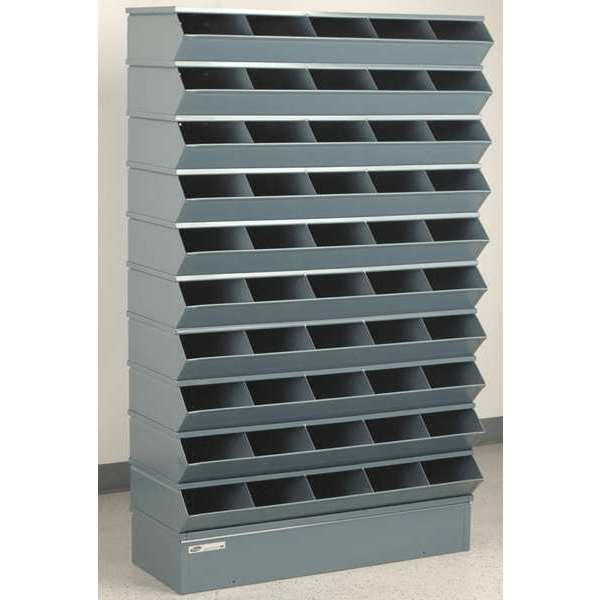 Sectional Bin Unit, Steel, High Gloss, Gray, Overall Depth 13 in, Overall Height 60 in, Overall Width 37 in, Load Capacity per Shelf 5,000 lb, Whole Unit Load Capacity 1,000 lb, Base Type Standard, Base Height 5 3/8 in, Number of Compartments 50, Compartment Depth 15 1/2 in, Compartment Height 6 in, Compartment Width 7 1/2 in, Includes (10) 5-Compartment #2 Sectional Stacking Bin Units, Base, Top Cover