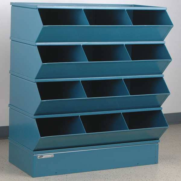 Sectional Bin Unit, Steel, High Gloss, Blue, Overall Depth 20 in, Overall Height 44 in, Overall Width 37 in, Load Capacity per Shelf 5,000 lb, Whole Unit Load Capacity 1,000 lb, Base Type Standard, Base Height 5 3/8 in, Number of Compartments 12, Compartment Depth 20 1/2 in, Compartment Height 9 1/2 in, Compartment Width 12 in, Includes (4) 3-Compartment #4 Sectional Stacking Bin Units, Base, Top Cover