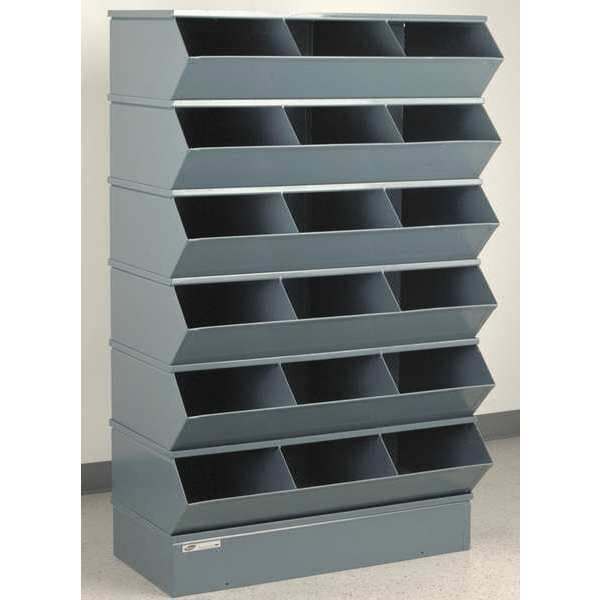Sectional Bin Unit, Steel, High Gloss, Gray, Overall Depth 20 in, Overall Height 63 in, Overall Width 37 in, Load Capacity per Shelf 5,000 lb, Whole Unit Load Capacity 1,000 lb, Base Type Standard, Base Height 5 3/8 in, Number of Compartments 18, Compartment Depth 20 1/2 in, Compartment Height 9 1/2 in, Compartment Width 12 in, Includes (6) 3-Compartment #4 Sectional Stacking Bin Units, Base, Top Cover