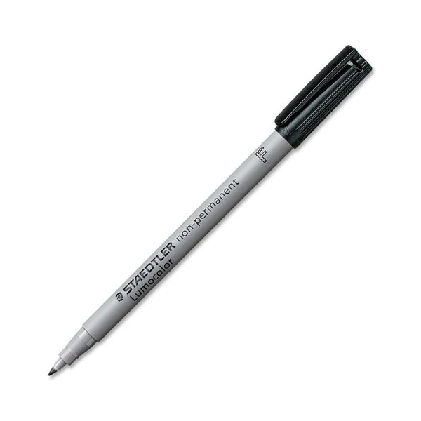 Nonpermanent marker is designed for overhead projection writing. Quick-drying, water-based, nonpermanent ink won't bleed or smudge. Write on overhead transparency film or such glossy surfaces as photos, transparency sleeves, slide frames, cromalins, glass, acrylic and vinyl. Water-soluble ink can be wiped off film using a damp cloth. It is great for crafts, graphic arts, photography, lab work or print shop. Fiber-tip pen features a polypropylene barrel and cap with a clip to attach to notebooks, pockets and more.