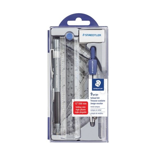 Math set features essential tools for students to perform various calculations and measurements in the classroom. Compass with an easy-to-grip top provides a firm grip for exact drawings. Plastic case with a hinged lid protects and organizes your items between uses. Set includes compass, eraser, mechanical pencil, set squares, protractor, ruler and sharpener.