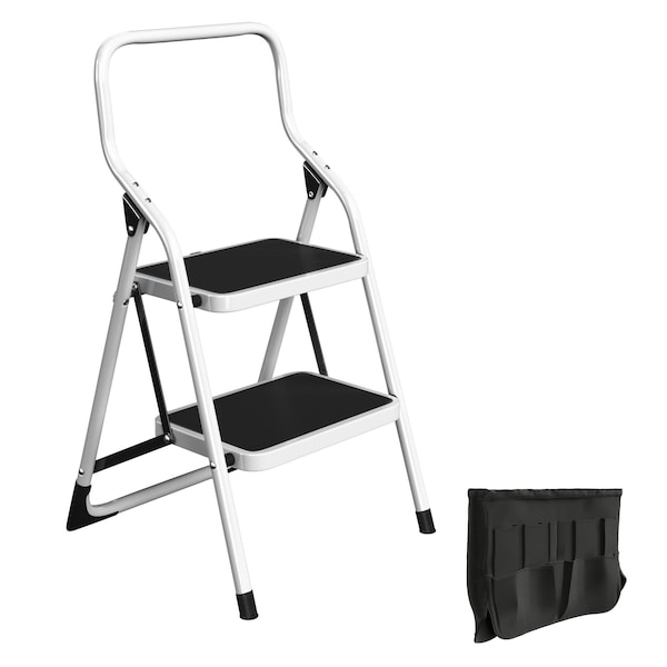 2-Step Stool - Folding Ladder with Handrails & Tool Bag - 330lb Capacity by White