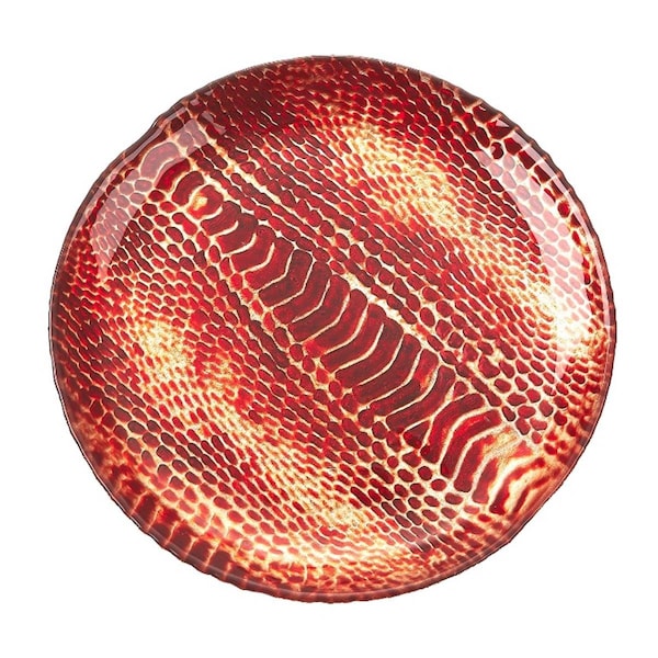 Gilded Tableware is unique in creating artful pieces that transform the ordinary into something extraordinary. We love to create enjoy and be inspired by the cultures and treasures of everyday life. We create artful tableware that is functional and is created by hand are food safe for Hot or Cold food. Each piece is handmade using spun glass technique and decorated on the back of the glass starting with the silver gold or copper leaf. Beautiful deep rich tones and textures of Snakeskin in this group. Reaching from Tribal to Contemporary the colors deep tones and textures are magnificent. Hand painted and decorated with patina painting and gold leaf gilding techniques. Food safe and oxidation free. Features -Set of 4 Specifications - Color: Coral - Size: 8.5 - Dimension: 1 H x 8.5 W x 8.5 L - Weight: 1.1 lbs