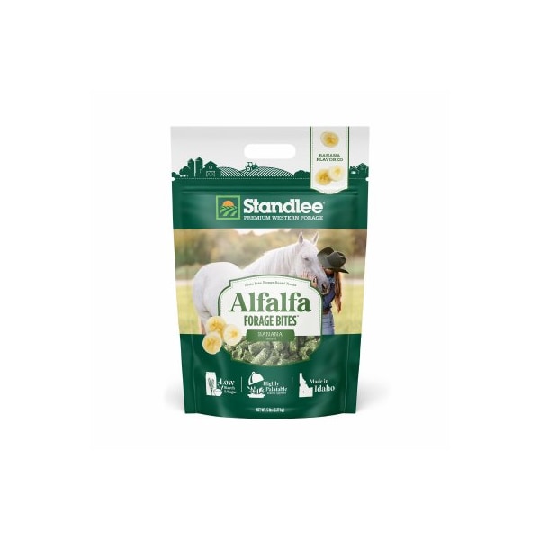 Standlee Premium 5LB Alfalfa Forage Bites. Banana flavored horse treats are made with premium alfalfa hay enhanced with banana flavoring with no grains or fillers added making them a treat that both animals and owners will love. Great for horses cattle and large livestock and safe for overweight horses and performance horses.