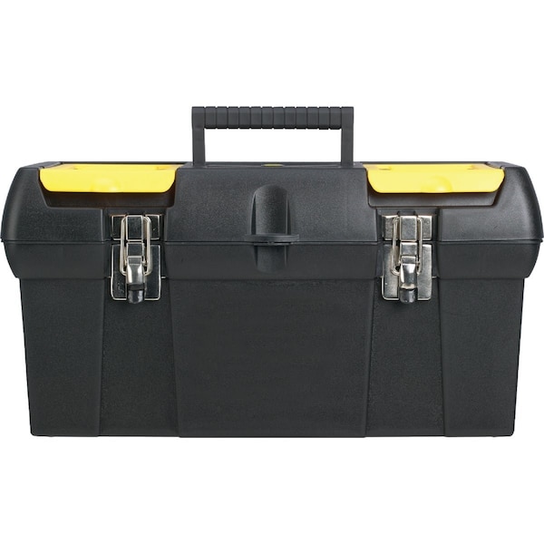 19. 2 lid organizers for small parts storage accessible without opening the toolbox. Built-in pad lock eye for small locks keeps contents secure. Soft wide rubber coated handle allows for easy and comfortable grip. Nickel metal-plated latches. Tote tray inside to store smaller items. 19 L. x 10 W. x 10 H.