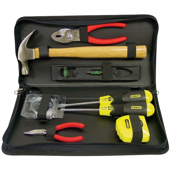 The Stanley 92-680 7-Piece Home & Office Tool Kit is a complete tool kit. It features standard tools perfect for the home, dorm, car or office. The kit includes a claw hammer, screwdrivers, 6" slip joint pliers, long-nose mini pliers, 8" torpedo level, picture hanging supplies and a 12' tape measure. The black waterproof case easily zips up for a portable tool kit for wherever you go. The Stanley 92-680 7-Piece Home & Office Tool Kit is something you will want to add to your collection of equipment.