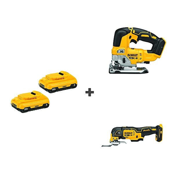 Battery Pack,(2) 4.0 Ah,Li-Ion,PK2, Voltage 20 V DC, Power Source Cordless, Number of Tools 2, Battery Capacity (2) 4.0 Ah, Tool Brand DEWALT(R), Series 20V MAX, Battery Included DCB240, Number of Batteries Included 2, Battery Model No. DCB240, Battery Series 20V MAX*, Charger Not Applicable, Charger Included Not Applicable, Cordless Tool Kit Contents (2) Bare Tools; (2) Batteries, Included Saws & Grinders Jig Saw; Oscillating Multi-Tool