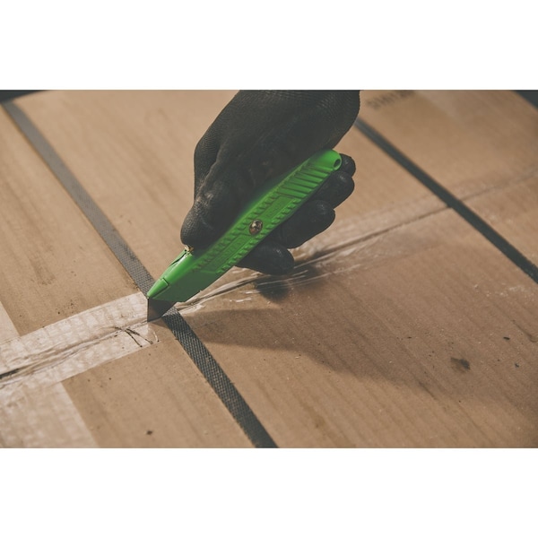 High-visibility interlocking retractable utility knife. Contoured design to fit hand. Diagonal ribs provide grip. 3-position blade. Includes 3 heavy-duty blades.