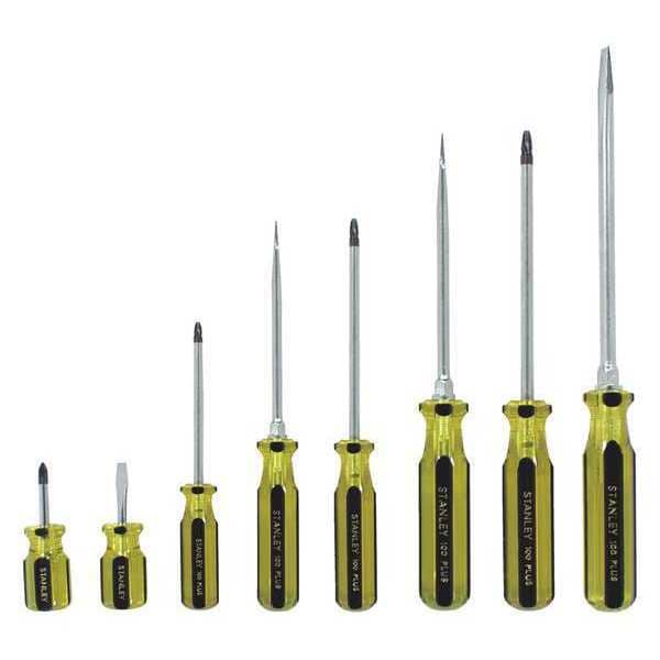 Stanley's 66-158-A Screwdriver Set is a complete set of screwdrivers for tackling various tasks. This 8-piece set includes the most commonly used tips in keystone slotted and Phillips styles. It comes with both keystone slotted and Phillips screwdriver tips, so you can use it to tackle different types of screws. The tip sizes range from 1/4" to 3/8", while the #1, #2 and #3 are included in this kit. The chrome plated finish on the alloy steel shank offers durability, while its acetate handle provides comfort when gripped. With Stanley's 66-158-A Screwdriver Set, you will have all the tools you need to get your job done quickly and efficiently.