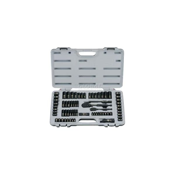 STANLEY® 92-824, 69 PIECE FRACTIONAL/METRIC LASER ETCHED SOCKET SET BLACK CHROME FINISH FOR ANTI-CORROSION PROTECTION AND ATTRACTIVE APPEARANCE. LASER-ETCHED MARKINGS FOR SIZE VISIBILITY. CHROME VANADIUM FORGED BODY FOR TORQUE, STRENGTH AND DURABILITY. QUICK RELEASE SWITCH AND REVERSIBLE MECHANISM FOR EASY OPERATION. KNURLED HANDLE FINISH FOR SLIP RESISTANCE. MEETS OR EXCEEDS ANSI SPECIFICATIONS. CONTAINS: (33) 3/8" DRIVE SOCKETS, (30) 1/4" DRIVE SOCKETS, (1) 3/8" DRIVE PEAR HEAD RACTHET, (1) 1/4" DRIVE PEAR HEAD RATCHET, (1) 3/8" DRIVE SPARK PLUG SOCKET-5/8", (1) 3/8" DRIVE SPARK PLUG SOCKET-13/16", (1) 1/4" DRIVE EXTENSION BAR-3", (1) 3/8" DRIVE EXTENSION BAR-6", BLOW MOLDED CARRY CASE